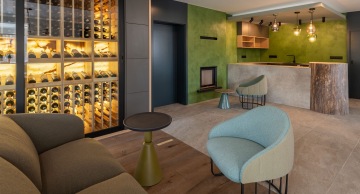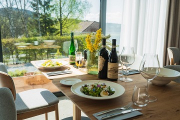 Příjemné posezení u dobrého jídla se sklenkou vína.